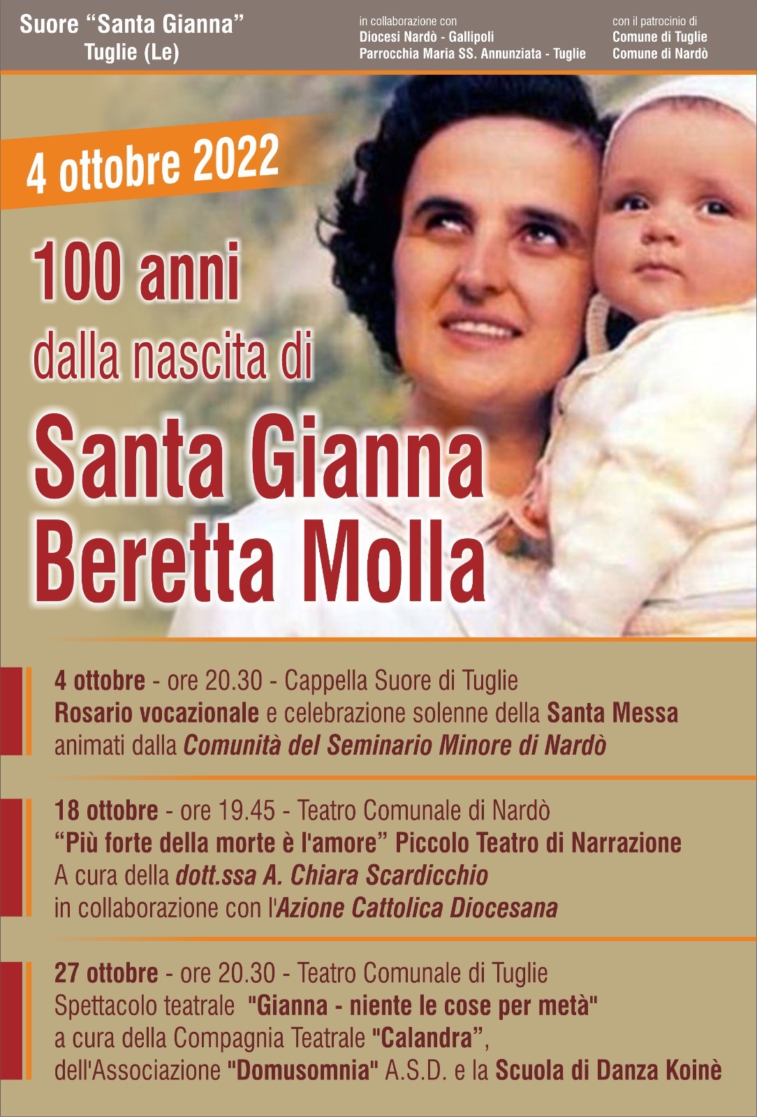 La comunità delle suore di Santa Gianna Beretta Molla in Tuglie, in occasione del centenario della nascita della santa, è lieta di invitarvi a questi eventi per conoscere la sua santità laicale e la sua spiritualità familiare.