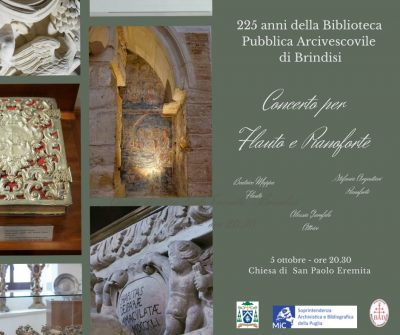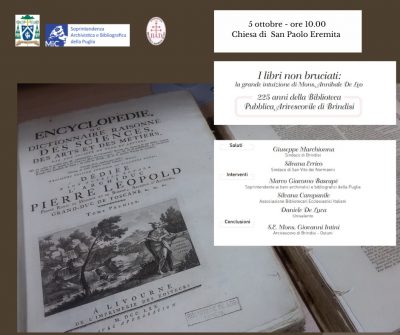 Istituita da mons. Annibale De Leo il 5 ottobre 1798, la Biblioteca Pubblica Arcivescovile di Brindisi compie 225 anni. Un’occasione importante celebrata con contributi di istituzioni e studiosi la mattina del 5 ottobre a partire dalle ore 10 presso la chiesa di San Paolo eremita, a seguire la sera alle ore 20.30 un concerto di flauto e pianforte sempre nella chiesa di San Paolo. Alla nostra occasione parteciperanno il sindaco di San Vito dei Normanni, Silvana Errico, città che ha dato i natali a mons. De Leo, e il sindaco di Brindisi, Giuseppe Marchionna, città dove il prelato è morto ed ha fondato la prima biblioteca pubblica di Terra d’Otranto. Quindi il dott. Marco Bascapè, soprintendente ai Beni archivistici e bibliografici per la Puglia, la dott.ssa Silvana Campanile, del direttivo dell’ABEI, e il prof. Daniele De Luca, dell’Università del Salento, con le conclusioni di S. E. Mons. Giovanni Intini, arcivescovo di Brindisi Ostuni. La sera il concerto a cura di Beatrice Mappa (flauto), Stefania Argentieri (pianoforte) con il prezioso contributo di Alessia Garofalo (attrice). Per l’occasione nella giornata del 5 ottobre saranno esposti alcuni libri posti all’Indice che mons. De Leo non volle bruciare. Mentre ci accingiamo a festeggiare questo compleanno un po’ speciale, desideriamo avervi tutti con noi.