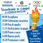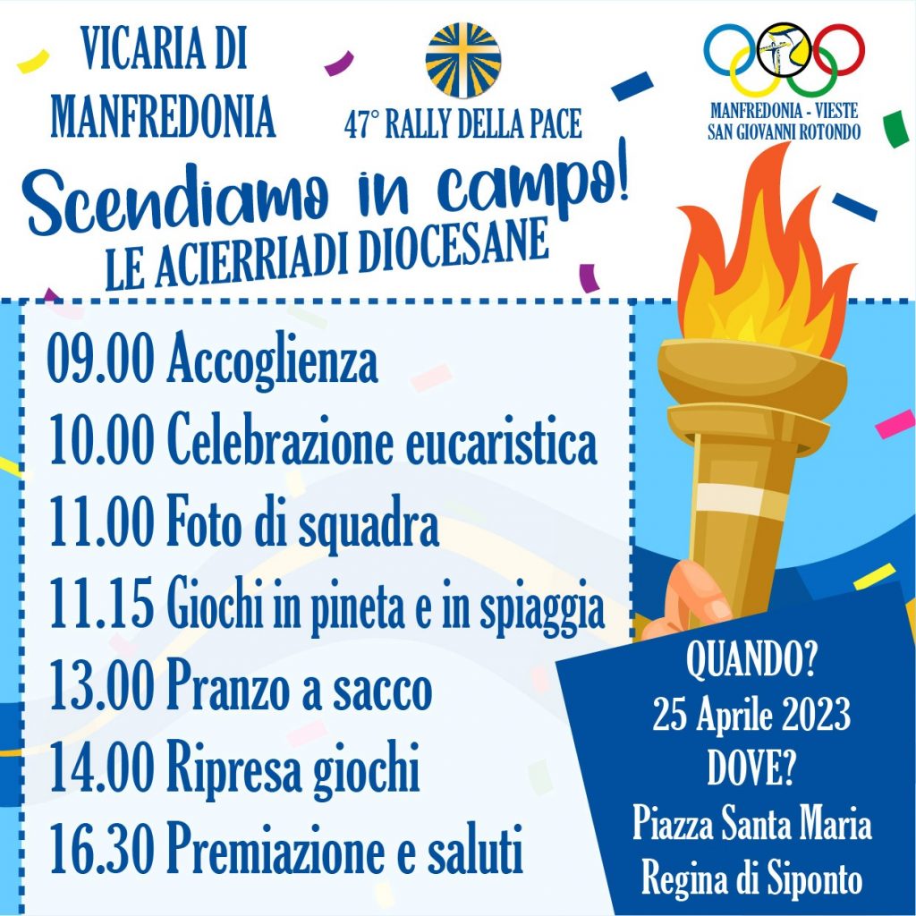 dioc. Manfredonia 47° Rally della Pace a Manfredonia e a Monte Sant’Angelo – Arcidiocesi di Manfredonia – Vieste – San Giovanni Rotondo 14 Aprile 2023 0 27 14 Aprile 2023 25 aprile 2023 Scendiamo in campo! Lo slogan del 47° Rally della Pace invita a “scendere in campo” e un fitto programma attende gli accierrini della diocesi. Il programma del 25 aprile nella Vicaria di Manfredonia e di Monte Sant’Angelo in locandina clic qui per l’articolo sul sito diocesano ARTICOLI CORRELATIALTRO DALL'AUTORE RETE INTERNAZIONALE “PRETI CONTRO IL GENOCIDIO” – Lettera aperta ai Vescovi Italiani in occasione della preghiera per la pace il giornalismo che fa vivere i settimanali diocesani – Arcidiocesi di Manfredonia – Vieste – San Giovanni Rotondo ORDINAZIONE DI DON MICHELE COPPOLECCHIA – Arcidiocesi di Manfredonia – Vieste – San Giovanni Rotondo ORDINAZIONE PRESBITERALE DI DON ELISEO COSTANTINO – Arcidiocesi di Manfredonia – Vieste – San Giovanni Rotondo GIORNATA MONDIALE DEI POVERI – 2025 – Arcidiocesi di Manfredonia – Vieste – San Giovanni Rotondo