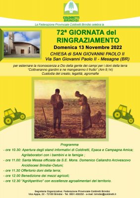Domenica 13 Novembre 2022 si svolgerà la 72^ Giornata del Ringraziamento, organizzata da Coldiretti Provinciale Brindisi con la S. Messa presieduta dal Vescovo di Brindisi-Ostuni, Mons. Domenico Caliandro, nella chiesa San Giovanni Paolo II in Mesagne.
