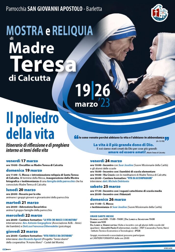 A BARLETTA MOSTRA E RELIQUIA DI MADRE TERESA DI CALCUTTA Dal 16 al 26 marzo 2023, a Barletta, nella Parrocchia San Giovanni Apostolo, si terrà l’iniziativa “Mostra e Reliquia di Madre Teresa di Calcutta” sul tema “Il poliedro della vita. Itinerario di riflessione e di preghiera intorno ai temi della vita” «Questa iniziativa – scrive don Rino Mastrodomenico in una comunicazione ai … Continua a leggere A BARLETTA MOSTRA E RELIQUIA DI MADRE TERESA DI CALCUTTA