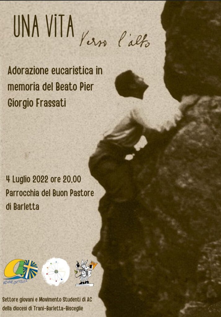 A BARLETTA VEGLIA DI PREGHIERA IN MEMORIA DEL BEATO PIER GIORGIO FRASSATI Lunedì 4 luglio 2022 ricorre la memoria liturgica del Beato Pier Giorgio Frassati. Per l’occasione, a Barletta, nella Parrocchia Buon Pastore, alle 20.00, si terrà una veglia di preghiera promossa dal Settore Giovani di Azione Cattolica. In una comunicazione dei responsabili del Settore Giovani si apprendono le motivazioni alla base dell’iniziativa e si … Continua a leggere A BARLETTA VEGLIA DI PREGHIERA IN MEMORIA DEL BEATO PIER GIORGIO FRASSATI