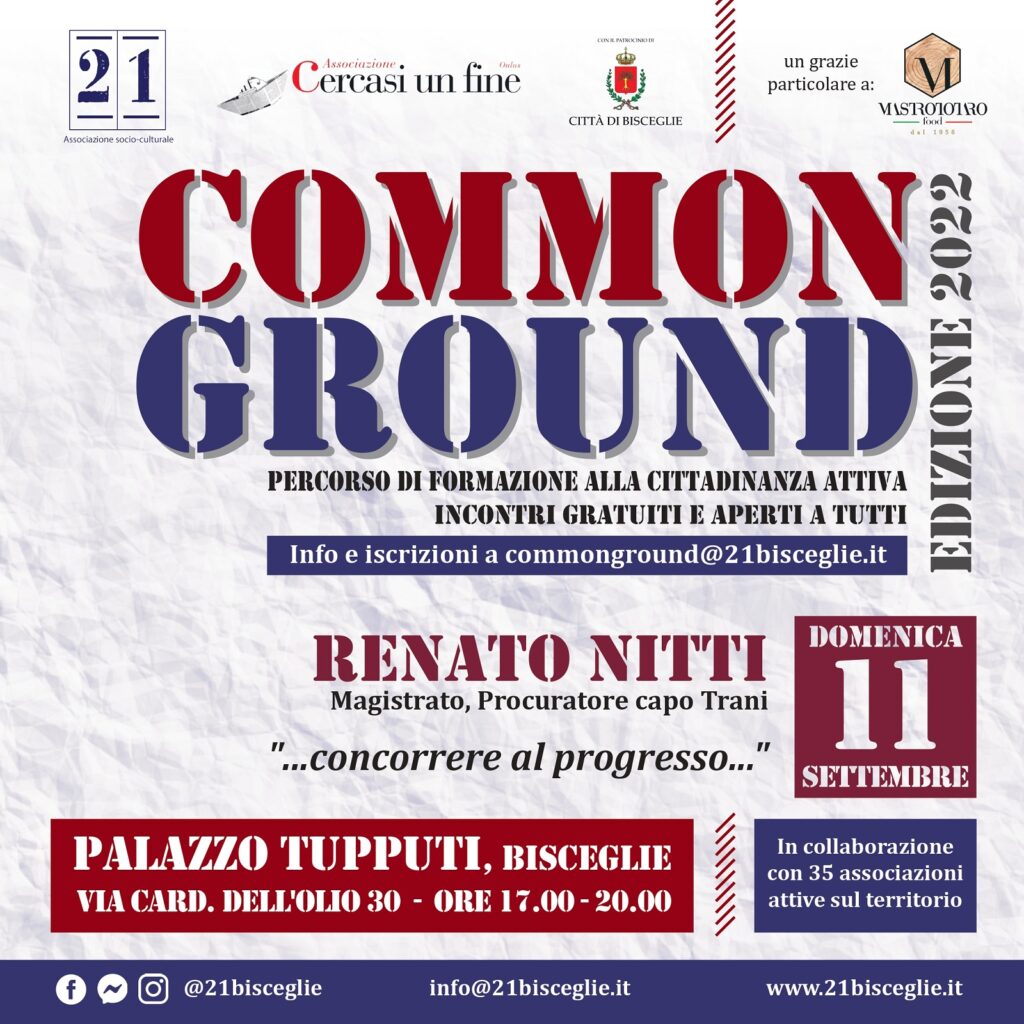 A Bisceglie il procuratore Renato Nitti, incontro domenica 11 settembre Appuntamento alle 17.00 a Palazzo Tupputi con Common Ground, percorso gratuito di formazione alla cittadinanza attiva organizzato da Associazione 21 e Cercasi un fine Il procuratore capo di Trani Renato Nitti ospite a Bisceglie di Common Ground, il percorso di formazione alla cittadinanza attiva ideato da Associazione 21 e Cercasi un fine. Appuntamento domenica … Continua a leggere A Bisceglie il procuratore Renato Nitti, incontro domenica 11 settembre