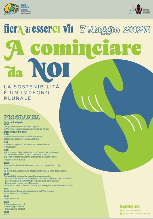 A BISCEGLIE LA VII EDIZIONE DI “FIERA D’ESSERCI”   L’importante appuntamento  – fierA di esserCI  – che si svolge tradizionalmente una volta ogni triennio si terrà quest’anno a Bisceglie, domenica 7 maggio, dalle 9:00 alle 17:30. Oltre ad essere un momento di festa, di condivisione, di promozione associativa e di incontro con tutta la diocesi, fierA di esserCI sarà l’occasione per riflettere insieme sul tema … Continua a leggere A BISCEGLIE LA VII EDIZIONE DI “FIERA D’ESSERCI” »