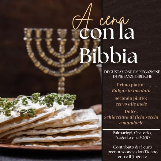 Il 6 agosto, presso l’Oratorio di Palmariggi alle ore 20.30, “A cena con la Bibbia”.