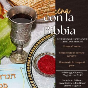 Il 22 agosto, presso l’Oratorio di Palmariggi alle ore 20.30, “A cena con la Bibbia”. Un banchetto speciale che prevede la degustazione e spiegazione di pietanze bibliche. Contributo di 15 Euro, prenotazione obbligatoria entro il 18 agosto.