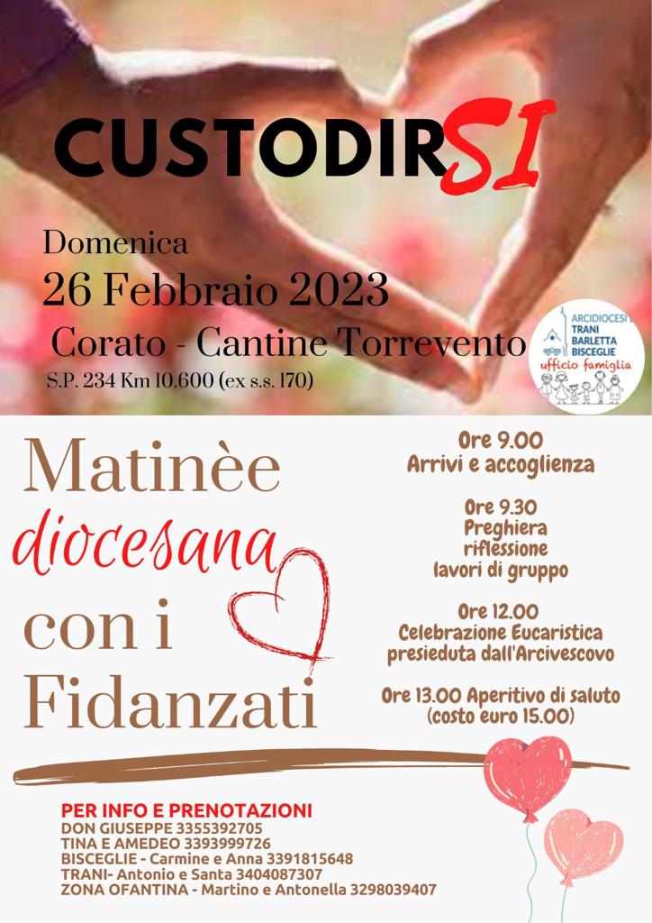 A CORATO UNA “MATINEE DIOCESANA CON I FIDANZATI”   Domenica 26 febbraio, a Corato, presso le Cantine Torrevento (S. P. 234 Km 10,600 , ex s.s. 170), a cura dell’Ufficio diocesano Famiglia, si terrà “CustodirSi” una “Matinèè diocesana  con i fidanzati, secondo il seguente programma: Ore 9.00, Arrivi e accoglienza Ore 9.30, Preghiera, riflessione, lavori di gruppo Ore 12.00, Celebrazione eucaristica presieduta dall’Arcivescovo Ore 13.00, … Continua a leggere A CORATO UNA “MATINEE DIOCESANA CON I FIDANZATI” »