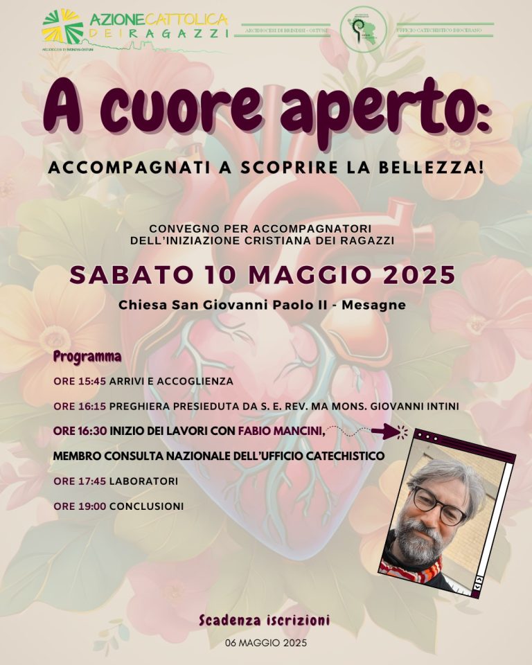 convegno catechisti ed educatori A.C.R., A cuore aperto. Accompagnati a scoprire la bellezza, che si terrà a Mesagne, presso la Chiesa san Giovanni Paolo II il 10 Maggio p.v.. Nella lettera troverete il link per l’iscrizione, che dovrà essere compilata entro e non oltre il 6 maggio.
