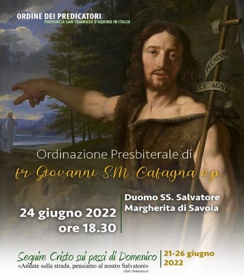A MARGHERITA DI SAVOIA L’ORDINAZIONE PRESBITERALE DI FRA GIOVANNI S.M. CAFAGNA DEI PADRI DOMENICANI Venerdì 24 giugno 2022, a Margherita di Savoia, nella Parrocchia Santuario SS. Salvatore, durante una solenne concelebrazione eucaristica presieduta da S.E. Mons. Domenico Cornacchia, Vescovo di Molfetta-Ruvo-Giovinazzo-Terlizzi, Fr Giovanni S.M. OP sarà ordinato presbitero. Il programma delle celebrazioni in preparazione all’evento: MARTEDI 21 GIUGNO, memoria di San Luigi Gonzaga, religioso Ore … Continua a leggere A MARGHERITA DI SAVOIA L’ORDINAZIONE PRESBITERALE DI FRA GIOVANNI S.M. CAFAGNA DEI PADRI DOMENICANI