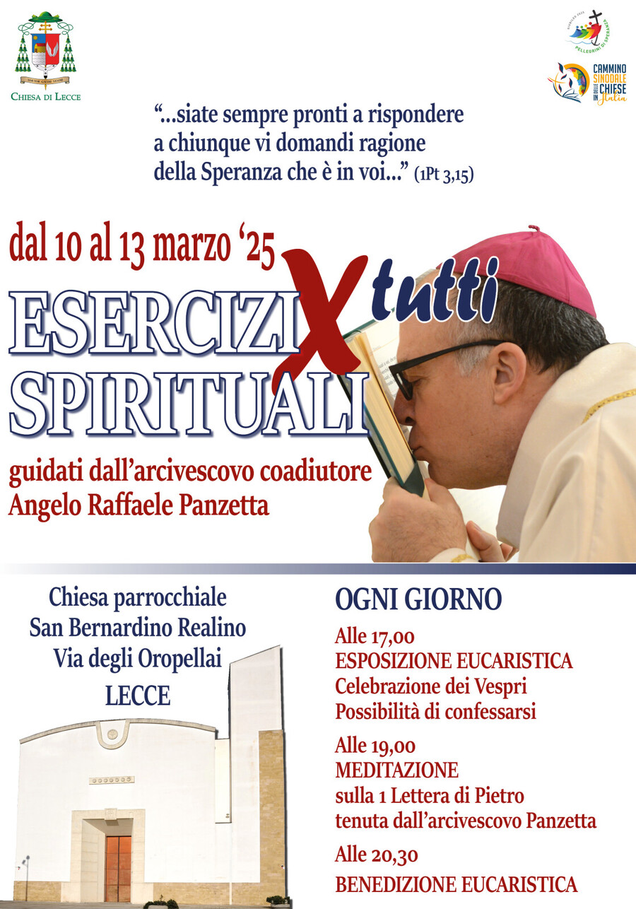 La Chiesa di Lecce, sotto la guida degli arcivescovi Michele Seccia e Angelo Raffaele Panzetta, sente il bisogno di vivere questo tempo austero e radicale, nell’Anno giubilare, dando seguito alle parole contenute nel capitolo secondo del libro del profeta Osea: “ecco la attirerò a me, la condurrò nel deserto e parlerò al suo cuore” (Os 2,16).