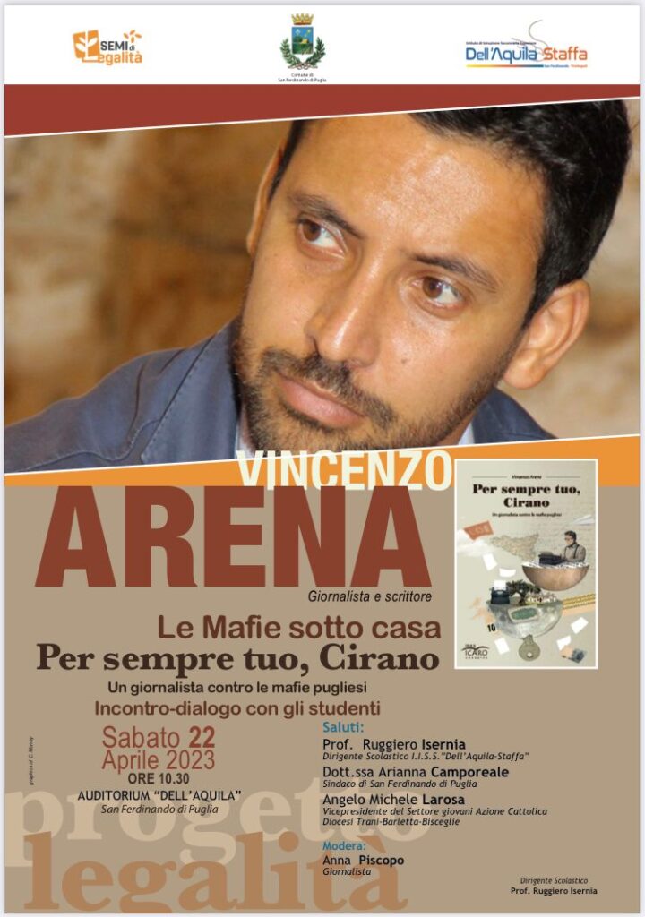 A SAN FERDINANDO SI PARLA DELLE MAFIE SOTTO CASA L’IISS “Dell’Aquila-Staffa” ospita l’autore Vincenzo Arena nell’ambito del progetto Legalità Sabato 22 aprile 2023, dalle ore 10.30, l’auditorium dell’IISS “Dell’Aquila-Staffa” di San Ferdinando di Puglia ospiterà l’ultimo appuntamento del progetto Legalità promosso dall’istituto scolastico, ideato e coordinato dalla docente di diritto professoressa Devangelio Armonia Lucia. Le studentesse e gli studenti dialogheranno con Vincenzo Arena, autore del … Continua a leggere A SAN FERDINANDO SI PARLA DELLE MAFIE SOTTO CASA »
