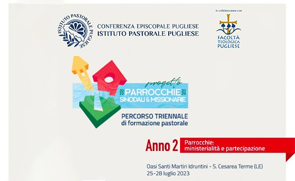 Dal 25 al 28 luglio, nella cornice dell’Oasi dei Martiri Idruntini di Santa Cesarea Terme (Le), l’Istituto pastorale pugliese (Ipp) ha vissuto il secondo anno del percorso triennale di formazione pastorale “Parrocchie sinodali e missionarie” con il tema “Ministerialità e partecipazione”. L’Istituto pastorale pugliese, presieduto da mons. Giuseppe Satriano e diretto da don Piero De Santis, propone questo itinerario formativo congiunto per presbiteri, religiosi e laici, affinché insieme possano confrontarsi sui cambiamenti che le forme ministeriali ecclesiali sono chiamate ad assumere perché si realizzi una piena partecipazione e corresponsabilità di tutti i battezzati all’edificazione della comunità. Circa ottanta sono stati i partecipanti da tutta la Puglia a questo secondo anno del percorso, animato da un’équipe regionale coordinata da don Francesco Zaccaria e in collaborazione con la Facoltà Teologica Pugliese, rappresentata dal preside don Vito Mignozzi. Ad arricchire il confronto ci sono anche alcuni partecipanti dalla Sicilia e dal Veneto, questi ultimi membri dell’equipe del progetto “Parrocchia Triveneto”, coordinato da fratel Enzo Biemmi e gemellato con questo percorso pugliese.