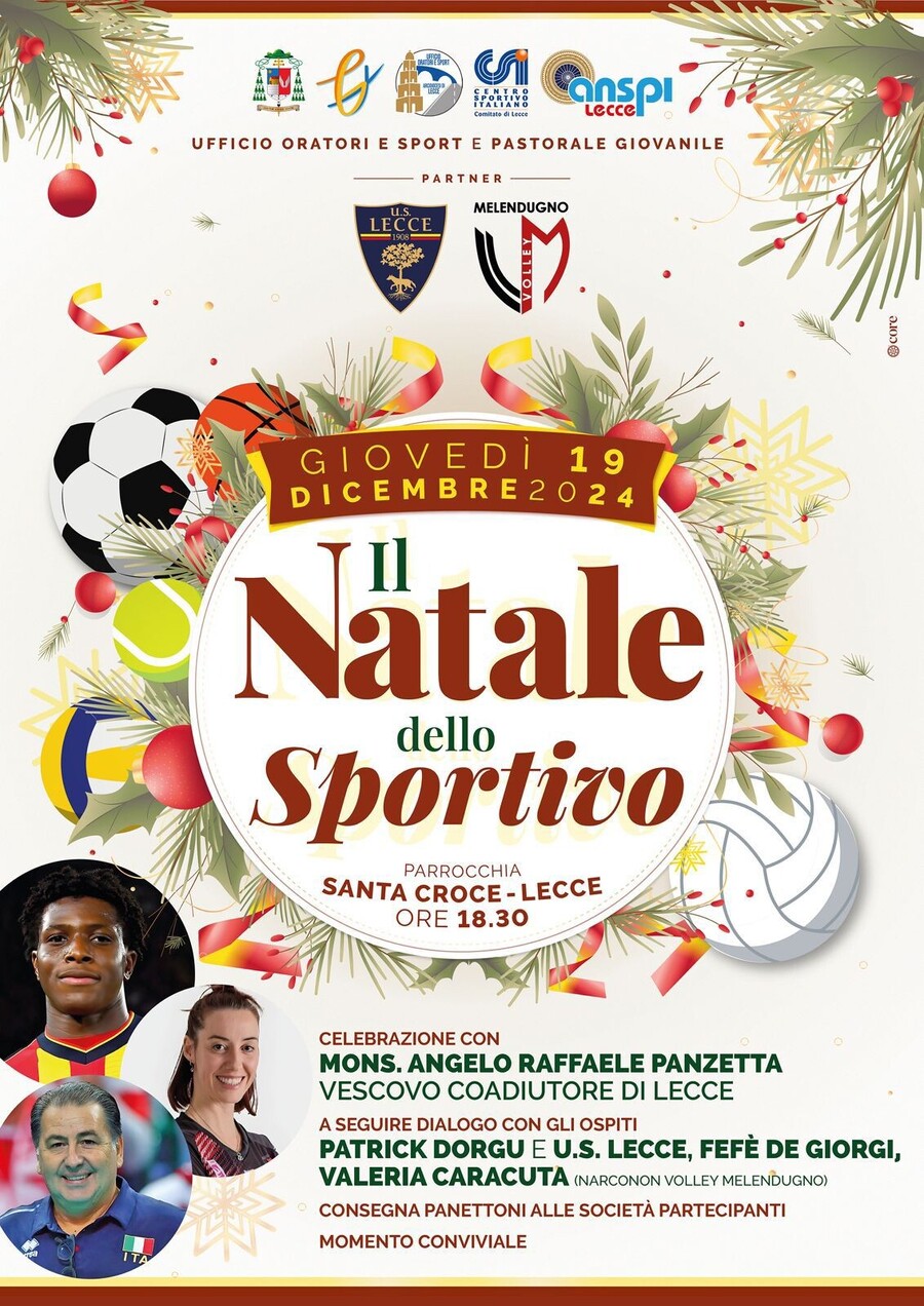 Il Natale dello sportivo si svolgerà oggi 19 dicembre presso la basilica di Santa Croce in Lecce, alle 18,30. Sarà mons. Panzetta ad accogliere gli sportivi che parteciperanno a questa edizione. Subito dopo, sempre in basilica, ci sarà un momento di dialogo con alcuni atleti: il calciatore del Lecce Patrick Dorgu, l’allenatore della Nazionale italiana maschile di pallavolo Fefè De Giorgi e la capitana della Volley Melendugno e già nazionale italiana Valeria Caracuta. L’incontro terminerà poi con gli auguri per il Natale ed un momento di agape fraterna. Condurrà l’incontro Marco Calogiuri, vicepresidente del Centro sportivo italiano (Csi).