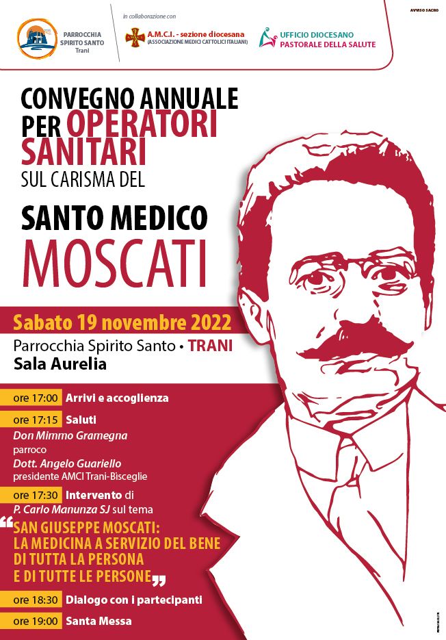 A TRANI IL CONVEGNO ANNUALE PER OPERATORI SANITARI PROMOSSO DALL’AMCI SULLA FIGURA DI SAN GIUSEPPE MOSCATI Presso la Sala Aurelia della parrocchia Spirito Santo un’assemblea incentrata sul tema della povertà sanitaria e sulla figura di San Giuseppe Moscati. Nel 2021 in Italia almeno 597.560 persone povere non hanno potuto acquistare i medicinali di cui avevano bisogno. Si tratta di 163.387 persone in più rispetto … Continua a leggere A TRANI IL CONVEGNO ANNUALE PER OPERATORI SANITARI PROMOSSO DALL’AMCI SULLA FIGURA DI SAN GIUSEPPE MOSCATI