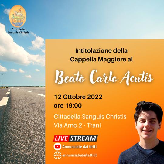 A TRANI LE RELIQUIE DEL BEATO CARLO ACUTIS. A LUI DEDICATA UNA CAPELLA Anche a Trani le reliquie del Beato Carlo avranno un luogo in cui potranno essere venerate. In occasione della memoria liturgica del Beato Carlo Acutis, domani, mercoledì 12 ottobre 2022, alle ore 19:00, presso la Cittadella Sanguis Christi in via Arno 2 a Trani (BT), con una solenne celebrazione eucaristica le Suore … Continua a leggere A TRANI LE RELIQUIE DEL BEATO CARLO ACUTIS. A LUI DEDICATA UNA CAPPELLA NELLA CITTADELLA SANGUIS CHRISTI