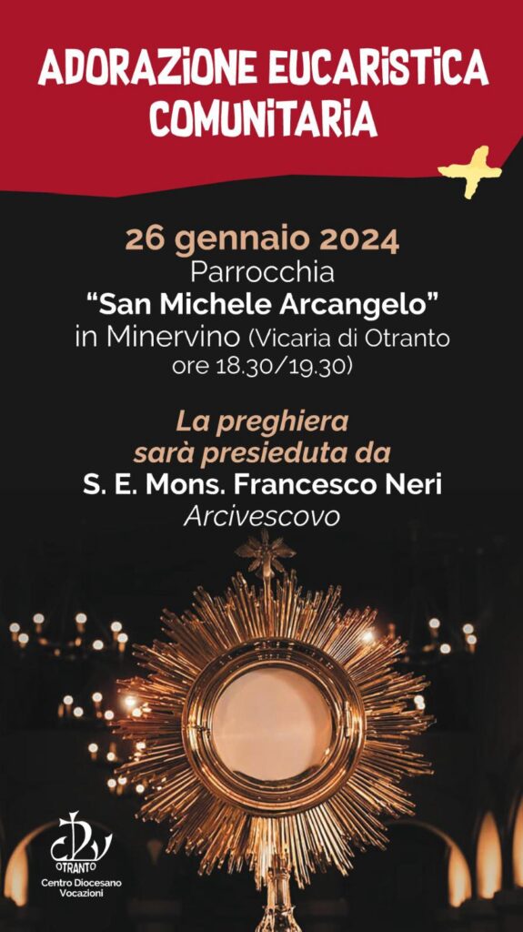 A Minervino di Lecce si terrà la prossima Adorazione eucaristica promossa dal Centro diocesano vocazioni e animata dal Seminario arcivescovile di Otranto. La presenza dell’Arcivescovo è il segno eloquente di una Chiesa in ascolto del Signore che chiama al servizio del Vangelo. Grati alla Vicaria di Otranto per l’accoglienza, partecipiamo con viva intensità.
