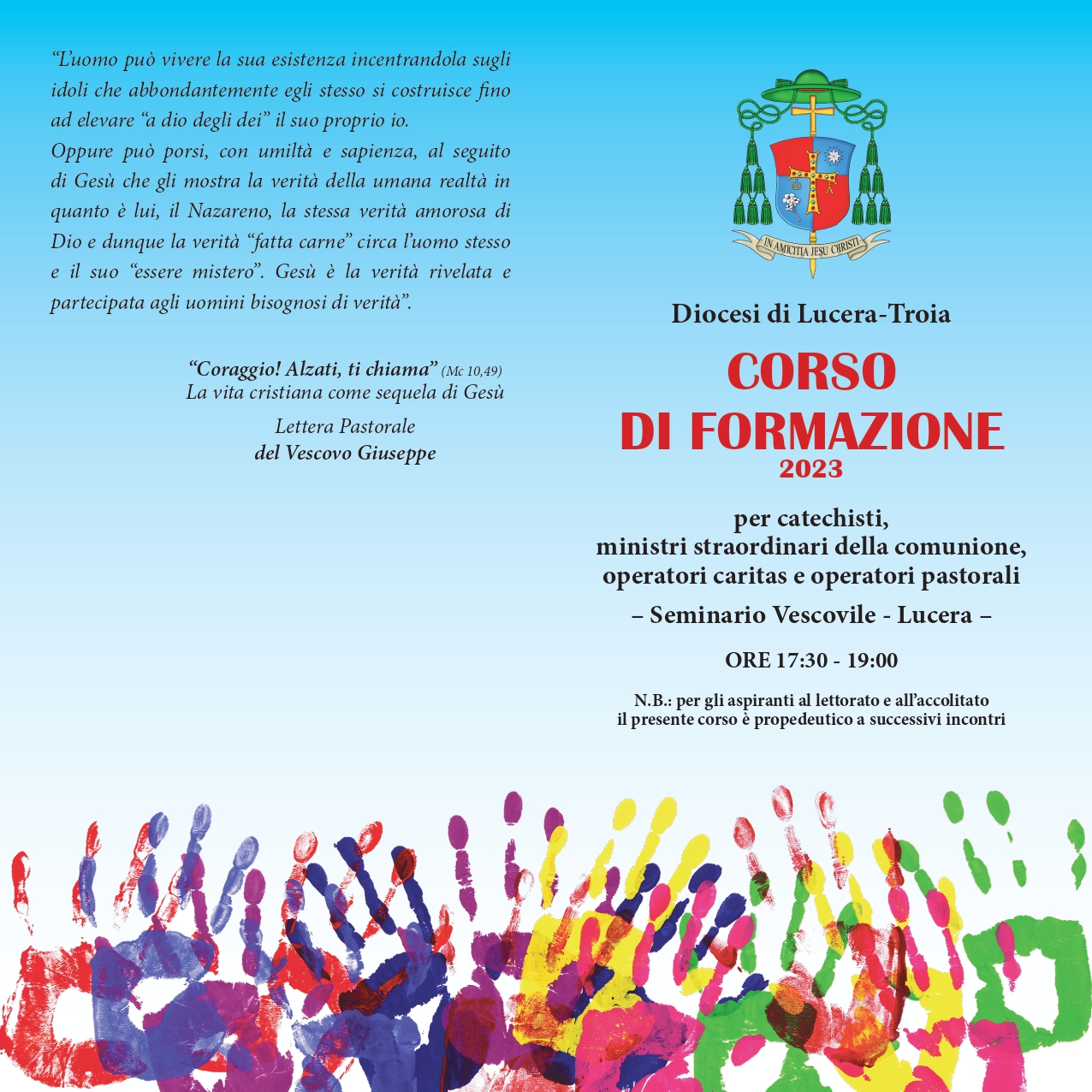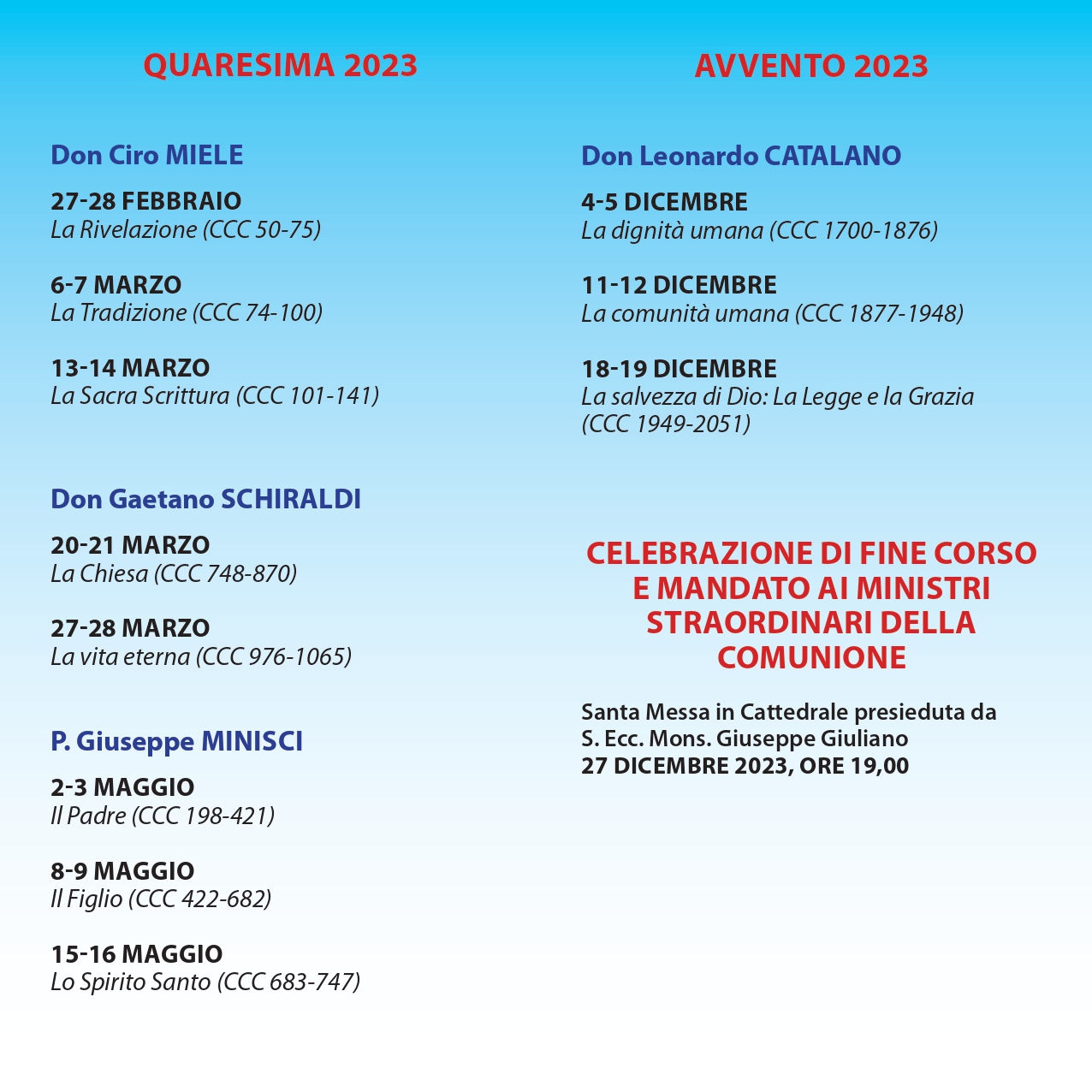 Gli appuntamenti, come da programma che segue, si terranno presso il Seminario Vescovile di Lucera, dalle ore 17.30 alle ore 19.00, fino al 27 dicembre 2023, quando verrà conferito il mandato ai ministri straordinari dell’Eucaristia.