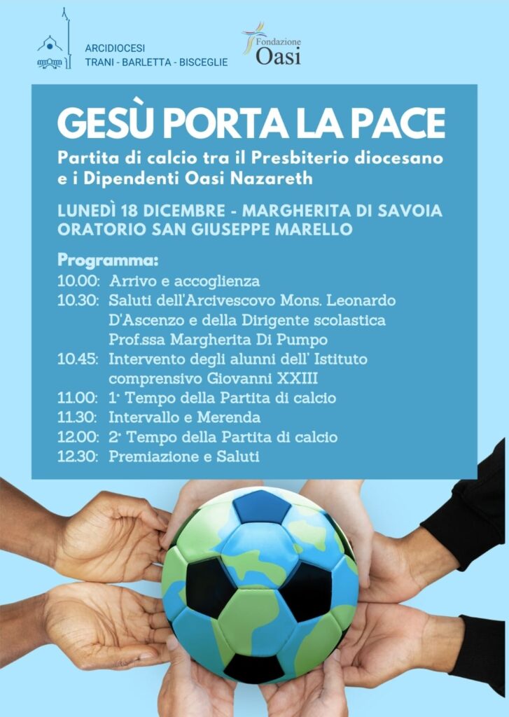 dioc. Trani ALTRA PARTITA DELLA SQUADRA DI CALCIO DEI PRESBITERI. QUESTA VOLTA CON LA RAPPRESENTATIVA DEI DIPENDENTI OASI DI NAZARETH 1 Dicembre 2023 0 32 clic qui per l’articolo sul sito della Diocesi di Trani-Bisceglie-Barletta ARTICOLI CORRELATIALTRO DALL'AUTORE INCONTRO DI CLERO ZONA PASTORALE TRANI “SAN NICOLA PELLEGRINO” Giovedì 20 novembre 2025 PDF: I CONTENUTI DEL PRIMO INCONTRO – Prof. Pier Cesare RIVOLTELLA Prof. Pier Cesare RIVOLTELLA – PRIMA SESSIONE INCONTRO DIOCESANO A CORATO UN INCONTRO SULLA LIBERTA’ DI STAMPA – Un diritto da conoscere, difendere e onorare – Per giornalisti e per l’intero pubblico BISCEGLIE, PARROCCHIA SANT’ANDREA APOSTOLO, CELEBRAZIONE EUCARISTICA PRESIEDUTA DALL’ARCIVESCOVO PER L’INIZIO DEL MINISTERO PASTORALE DI PARROCO DI DON FRANCESCO LORUSSO