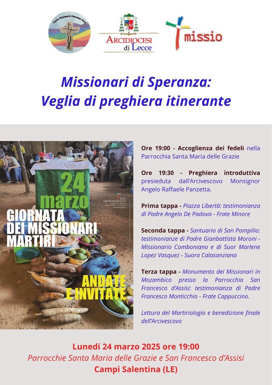Per l’occasione il Centro missionario diocesano, diretto dal diacono Vinicio Russo, celebra oggi 24 marzo la testimonianza dei martiri a Campi Salentina con una veglia di preghiera itinerante.