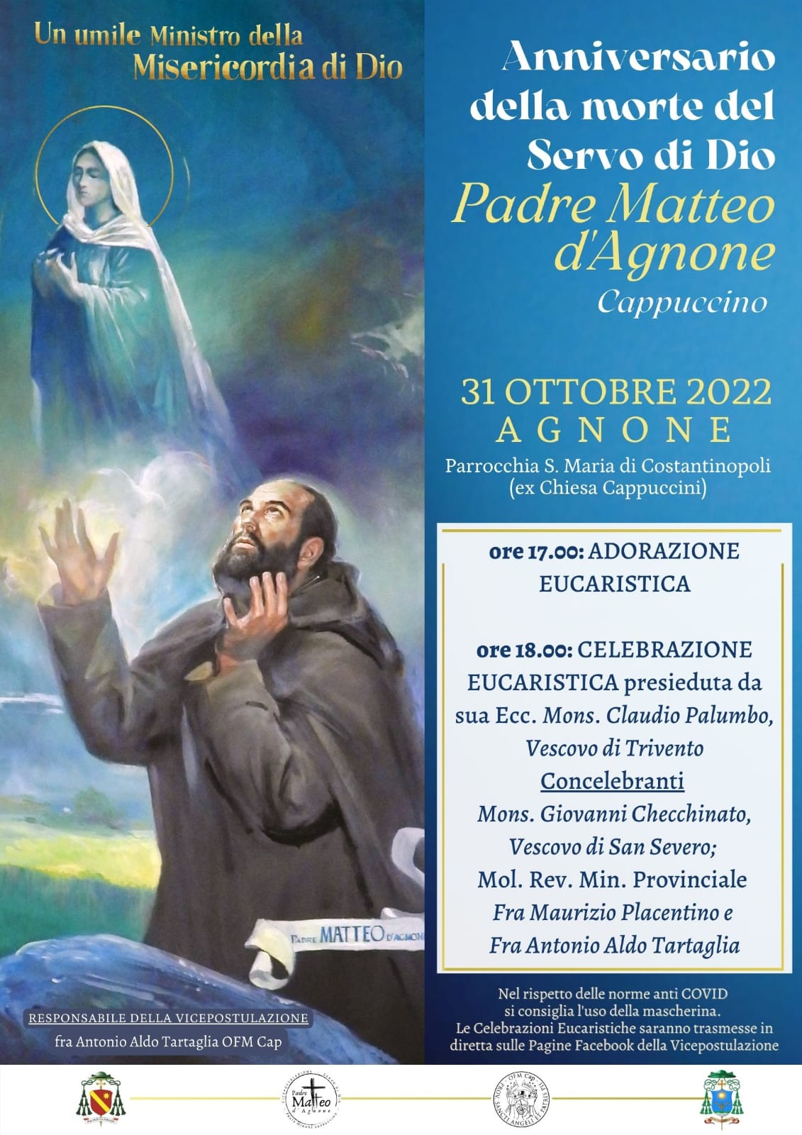 devoti del Servo di Dio Padre Matteo d’Agnone, il Signore vi dia pace. Ci prepariamo a vivere anche quest’anno la Celebrazione dell’anniversario della morte di Padre Matteo. Questo momento segna ormai da anni per la Provincia dei Frati Minori Cappuccini di Sant’Angelo e Padre Pio, delle due Diocesi di San Severo e Agnone, e per le comunità sorelle di Serracapriola, Agnone e Chieuti, e per tutti i devoti che da più parti si ritrovano, nei primi vespri della luminosa Solennità di Tutti i Santi, intorno alla Mensa della Parola e del Pane Eucaristico, una tappa fondamentale, che ci permette come Chiesa di sollevare lo sguardo alla Gerusalemme Celeste, dove vivono i Santi, nostri compagni di viaggio. Il loro luminoso esempio ci sproni, come Scriveva il Servo di Dio Padre Matteo d’Agnone a seguire Cristo Via, Verità e Vita: “O Via, o Verità o Vita. Seguiremo te perché sei la via, cammineremo dopo di te perché sei la Verità, correremo verso di te perché sei la Vita…”.