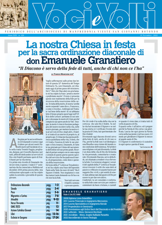 dioc. Manfredonia Anno XIII – n. 120 12 Novembre 2022 0 35 https://vocievolti.blog/anno-xiii-n-120/ clic qui per l’articolo sul sito diocesano ARTICOLI CORRELATIALTRO DALL'AUTORE RETE INTERNAZIONALE “PRETI CONTRO IL GENOCIDIO” – Lettera aperta ai Vescovi Italiani in occasione della preghiera per la pace ORDINAZIONE DI DON MICHELE COPPOLECCHIA – Arcidiocesi di Manfredonia – Vieste – San Giovanni Rotondo ORDINAZIONE PRESBITERALE DI DON ELISEO COSTANTINO – Arcidiocesi di Manfredonia – Vieste – San Giovanni Rotondo GIORNATA MONDIALE DEI POVERI – 2025 – Arcidiocesi di Manfredonia – Vieste – San Giovanni Rotondo Un voto per costruire Speranza e Fraternità – Arcidiocesi di Manfredonia – Vieste – San Giovanni Rotondo