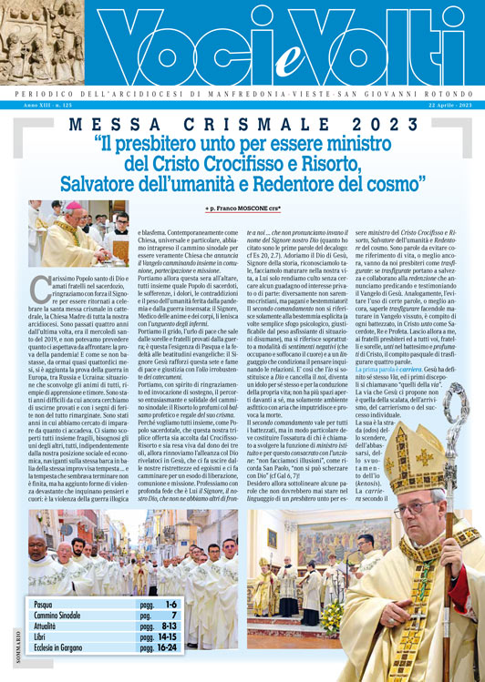 dioc. Manfredonia Anno XIII – Numero 125 21 Aprile 2023 0 32 https://vocievolti.blog/anno-xiii-n-125/ clic qui per l’articolo sul sito diocesano ARTICOLI CORRELATIALTRO DALL'AUTORE RETE INTERNAZIONALE “PRETI CONTRO IL GENOCIDIO” – Lettera aperta ai Vescovi Italiani in occasione della preghiera per la pace il giornalismo che fa vivere i settimanali diocesani – Arcidiocesi di Manfredonia – Vieste – San Giovanni Rotondo ORDINAZIONE DI DON MICHELE COPPOLECCHIA – Arcidiocesi di Manfredonia – Vieste – San Giovanni Rotondo ORDINAZIONE PRESBITERALE DI DON ELISEO COSTANTINO – Arcidiocesi di Manfredonia – Vieste – San Giovanni Rotondo GIORNATA MONDIALE DEI POVERI – 2025 – Arcidiocesi di Manfredonia – Vieste – San Giovanni Rotondo