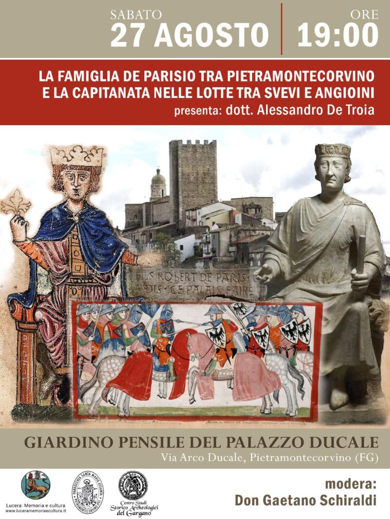 Sabato 27 agosto, alle ore 19:00, nella stupenda cornice del Giardino Pensile del Palazzo Ducale di Pietramontecorvino, il dott. Alessandro De Troia presenterà un incontro dal titolo “La famiglia De Parisio tra Pietramontecorvino e la Capitanata nelle lotte tra svevi e angioini”.
