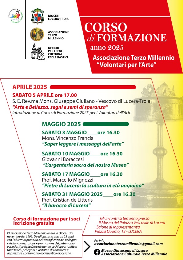 Sabato 5 aprile 2025, alle ore 17.00, presso il Salone di Rappresentanza del Palazzo Vescovile di Lucera, mons. Vescovo inaugurerà il percorso di formazione 2024/2025 per i volontari dell’Associazione “Terzo Millennio”, con una relazione dal tema: “Arte e Bellezza, segni e semi di speranza”.