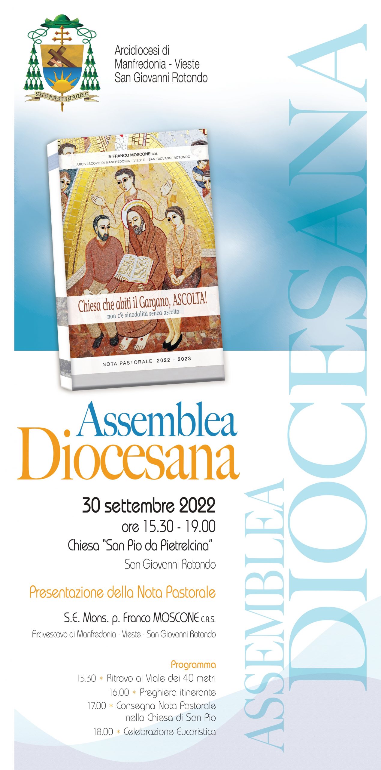 Seguendo la scia dell’ultima Lettera Pastorale sulla Trasfigurazione e guardando al percorso fatto quest’anno, caratterizzato dalle cinque sfide e dal Cammino Sinodale fuori e dentro “Casa” = Chiesa, venerdì 30 settembre, l’Arcivescovo padre Franco Moscone farà dono alla Diocesi della Nota Pastorale “Chiesa che abiti il Gargano, ASCOLTA! – Non c’è sinodalità senza ascolto” per il nuovo anno pastorale 2022/2023.