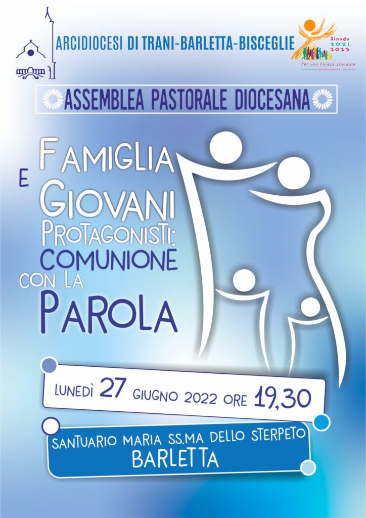 ASSEMBLEA PASTORALE DIOCESANA Sul tema “Famiglia e giovani protagonisti: comunione con la Parola” Barletta, Santuario Maria SS. dello Sterpeto, lunedì 27 giugno 2022, ore 19.30 Viviamo un momento di comunione con l’Assemblea Pastorale Diocesana a conclusione dell’anno lunedi 27 giugno p.v. alle ore 19,30 presso il Santuario Maria dello Sterpeto in Barletta
