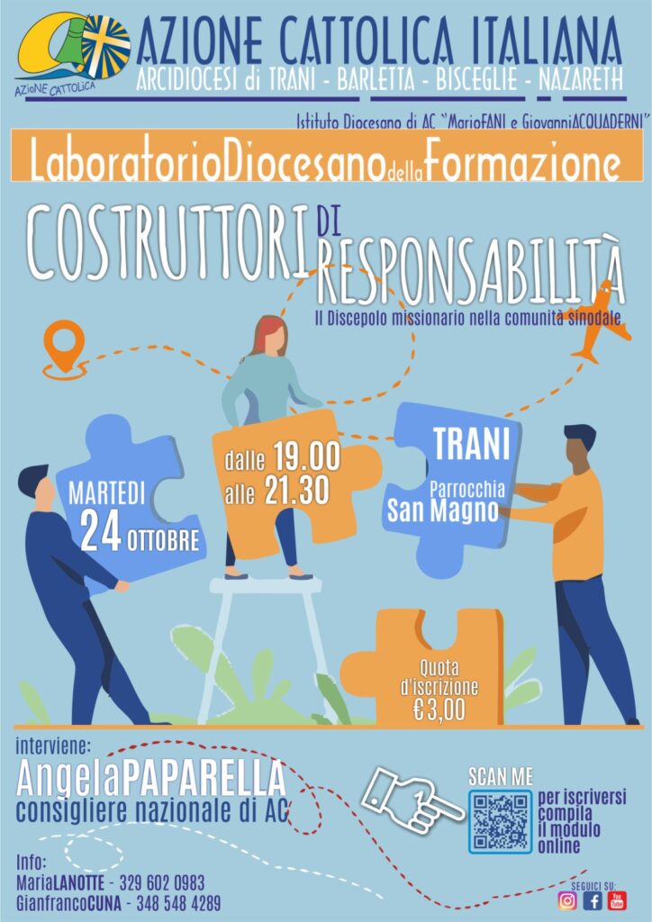 «L’Azione Cattolica diocesana, – scrivono in una comunicazione Don Gaetano Corvasce, Assistente unitario dell’Ac, Francesco Mastrogiacomo, Presidente diocesano dell’Ac, Maria Lanotte, Vicepresidente del Sa di Ac e referente del Ldf di Ac, L’Equipe diocesana del Ldf di Ac – per l’anno pastorale 2023/2024, desidera accompagnare i laici nel loro cammino di fede, approfondendo e facendo esperienza dello stile del discepolo missionario. Il percorso, organizzato … Continua a leggere AZIONE CATTOLICA. LA BORATORIO DIOCESANO DI FORMAZIONE SUL TEMA “COSTRUTTORI DI RESPONSABILITA’ IL DISCEPOLO MISSIONARIO NELLA COMUNITA’SINODALE”