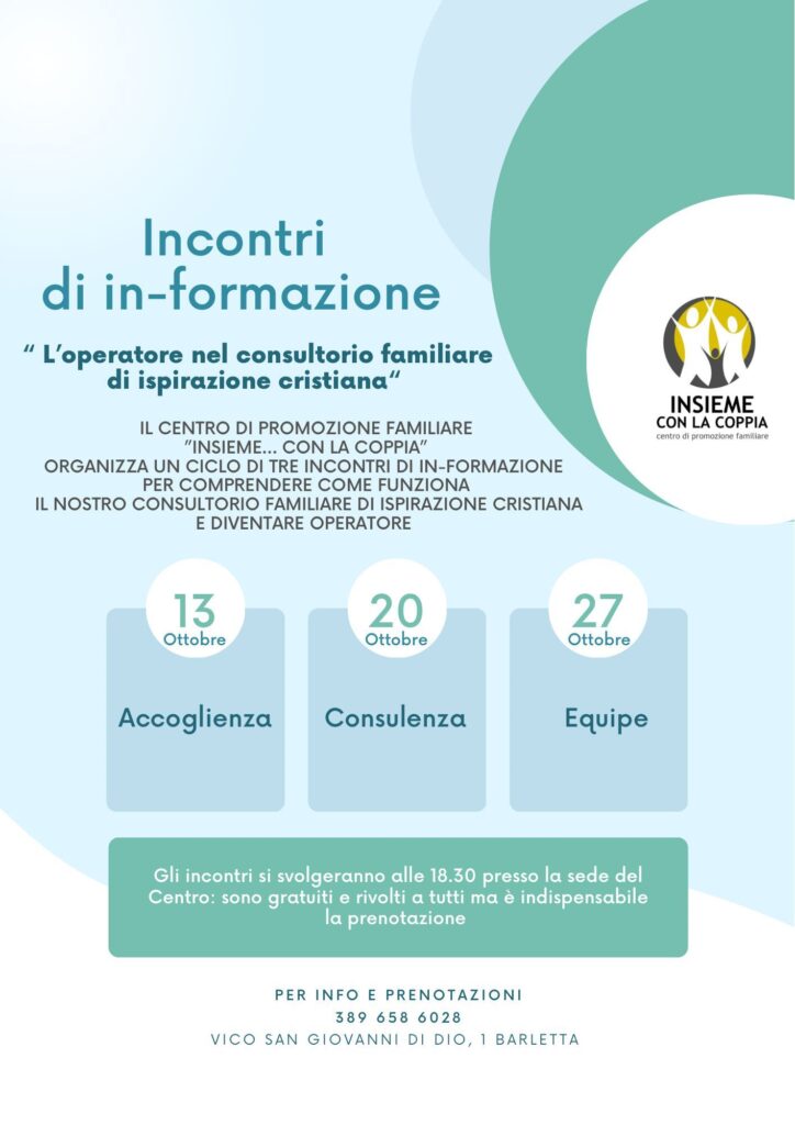 Il Centro di Promozione Familiare “Insieme…con la coppia”, organizza un ciclo di incontri di in-formazione per comprendere come funziona il nostro consultorio familiare di ispirazione cristiana. Per chi vorrà ci sarà anche la possibilità di diventare operatore e collaborare con l’equipe. Per info e prenotazioni: 389 658 6028. Vi aspettiamo numerosi. Maria Defazio, presidente del Centro di Promozione familiare Don Enzo Misuriello, assistente spirituale