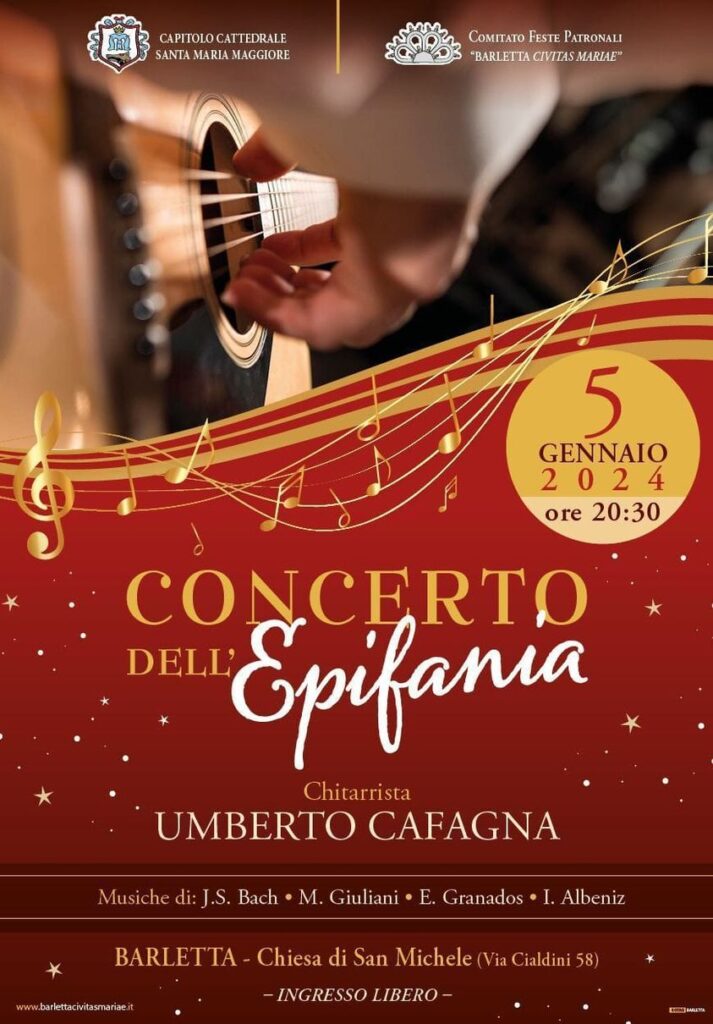 BARLETTA. CONCERTO DELL’EPIFANIA Venerdì 5  gennaio 2024, a Barletta, nella Chiesa di San Michele (Via Cialdini 58), a cura del Capitolo Cattedrale Santa Maria Maggiore e del Capitolo Feste Patronali “Barletta Caritas Mariae”, a cominciare dalle ore 20.30, avrà luogo il Concerto dell’Epifania a cura del Chitarrista Umberto Cafagna. Saranno eseguite musiche di J.S. Bach • M. Giuliani • E. Granados • I. Albéniz. Ingresso … Continua a leggere »