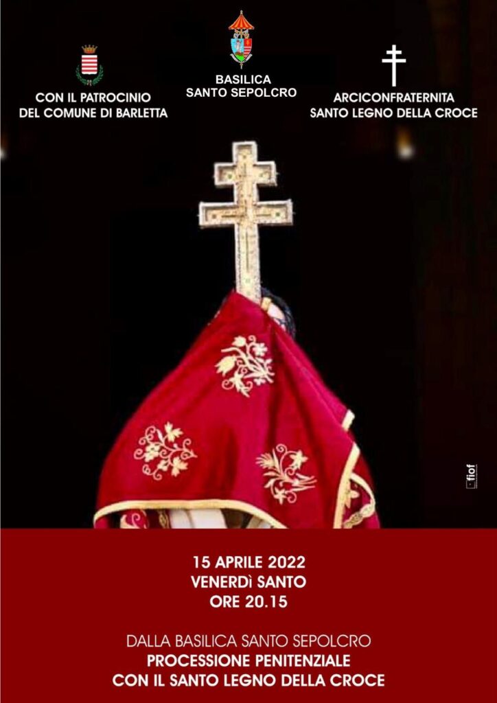 Dopo due anni di sospensione a causa della pandemia, venerdì Santo 15 aprile 2022 alle ore 20.15, dopo la celebrazione della Passione del Signore, presieduta dal parroco don Mauro Dibenedetto, con la partecipazione dell’Amministrazione Comunale nella persona del Commissario Straordinario dott. Francesco Alecci, rivivremo la plurisecolare processione penitenziale con il Santo Legno della Croce dalla Basilica Santo Sepolcro presieduta dal nostro Arcivescovo Mons. Leonardo D’Ascenzo. … Continua a leggere BARLETTA, DALLA BASILICA DEL SANTO SEPOLCRO, LA PROCESSIONE PENITENZIALE CON IL SANTO LEGNO DELLA CROCE