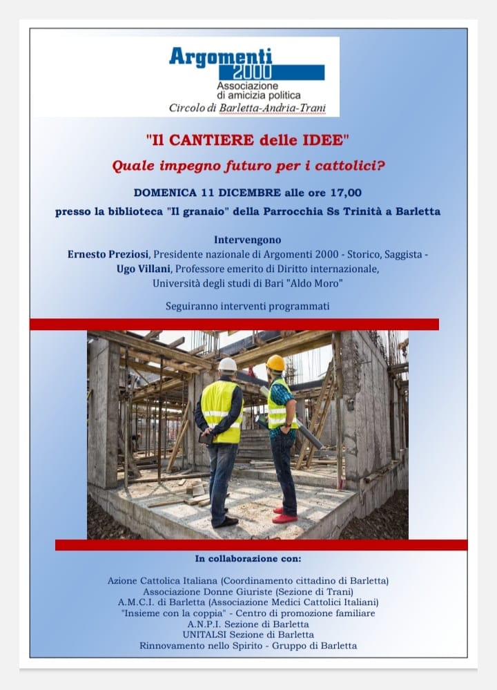 BARLETTA. IL CANTIERE DELLE IDEE Domenica 11 dicembre 2022, a Barletta, presso la biblioteca “Il granaio” della Parrocchia SS. Trinità, si terrà “Il Cantiere della idee. Quale impegno futuro per i cattolici?”. «L’idea di fondo di questo incontro – si legge in una comunicazione del Circolo di Barletta-Andria-Trani di Argomenti 2000 Associazione di amicizia politica organizzatrice dell’evento – è quella di mettere insieme amici … Continua a leggere BARLETTA. IL CANTIERE DELLE IDEE