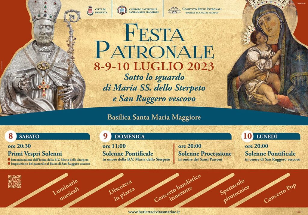 BARLETTA. IL PROGRAMMA DEI SOLENNI FESTEGGIAMENTI IN ONORE DEI SANTI PATRONI MARIA SS. DELO STERPETO E SAN RUGGERO VESCOVO (8-9-10 LUGLIO 2023) NELLA BASILICA SANTA MARIA MAGGIORE Di seguito il programma dei solenni festeggiamenti in onore dei Santi Patroni Maria SS. dello Sterpeto e San Ruggero Vescovo previsisti a Barletta nei giorni 8-9-10 luglio 2023 nella Basilica Santa Maria Maggiore: LUNEDÌ 3 … Continua a leggere BARLETTA. IL PROGRAMMA DEI SOLENNI FESTEGGIAMENTI IN ONORE DEI SANTI PATRONI MARIA SS. DELO STERPETO E SAN RUGGERO VESCOVO (8-9-10 LUGLIO 2023) NELLA BASILICA SANTA MARIA MAGGIORE