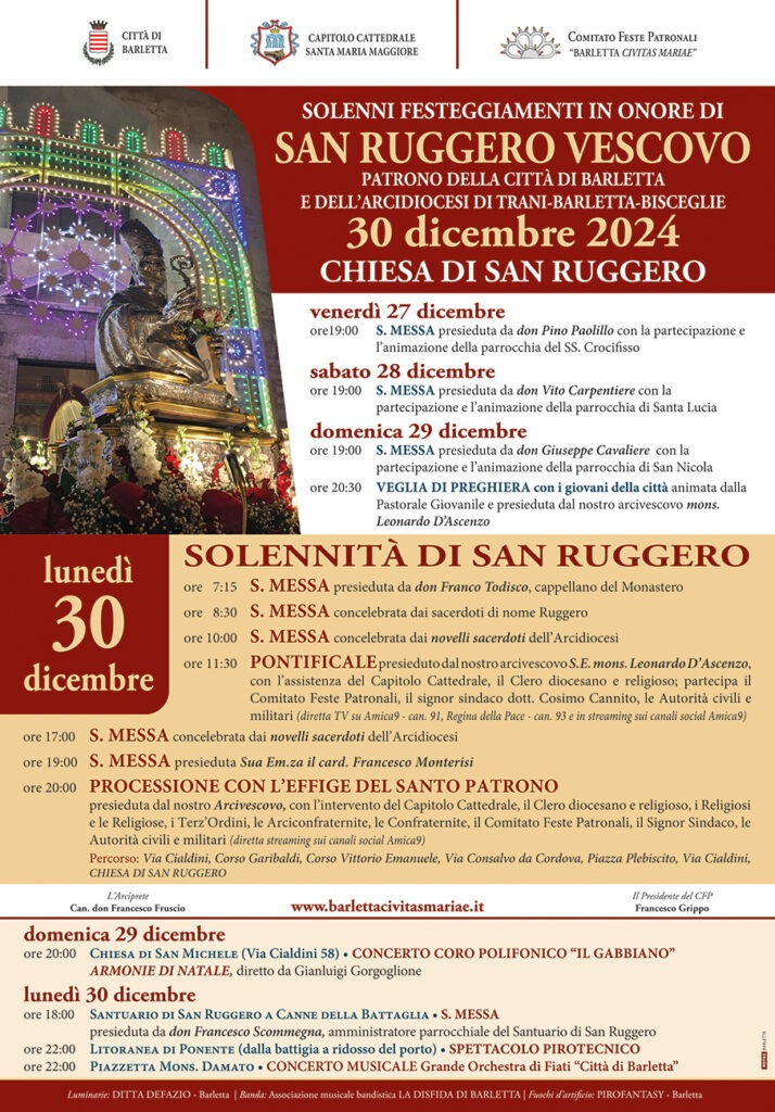 Il programma dei solenni festeggiamenti – comunicato dall’Arciprete Can. Don Francesco Fruscio e dal Presidente del Comitato Feste Patronali Francesco Grippo, e che vede il patrocinio del Comune di Barletta – in onore di San Ruggero, patrono della Città di Barletta e dell’Arcidiocesi di Trai-Barletta-Bisceglie, previsti il 30 dicembre nella Chiesa monastica di San Ruggero. Programma dei solenni festeggiamenti: mercoledì 27 dicembre ore19:00, santa … Continua a leggere