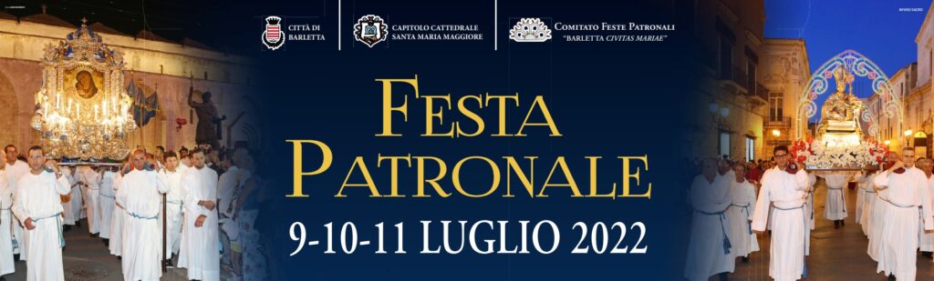 BARLETTA. IL PROGRAMMA DELLA FESTA PATRONALE 200x140cm festa patronale 2022 programma Il programma della Festa Patronale di Barletta, che va dal 9 all’11 luglio, è stato diffuso da una comunicazione e manifesti a firma di Don Francesco Fruscio, Arciprete, e  il Dott. Francesco Grippo, Presidente del Comitato Feste Patronali. E’ arrivo anche il sito interne www.barlettacivitasmariae.it   LUNEDÌ 4 LUGLIO ore 21:00, Santuario Maria SS. … Continua a leggere BARLETTA. IL PROGRAMMA DELLA FESTA PATRONALE »