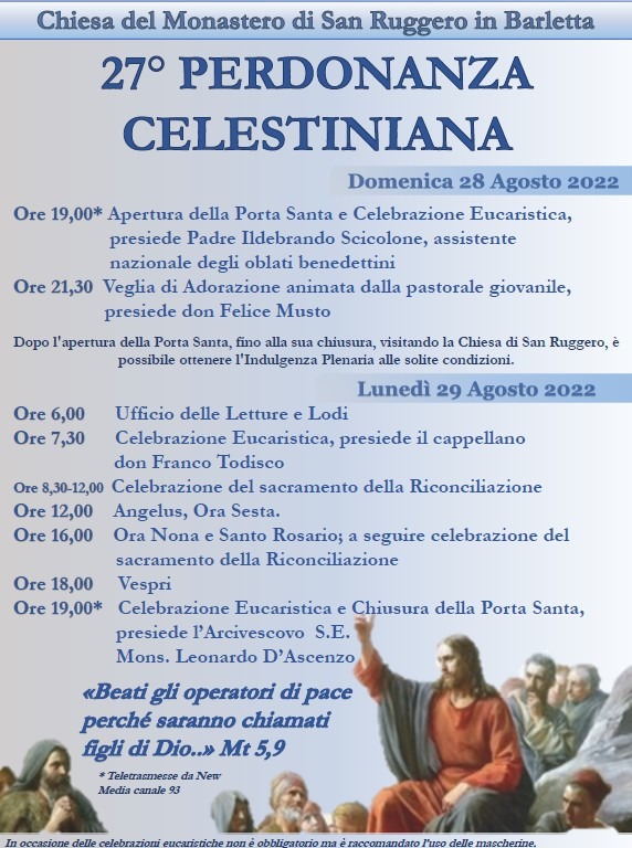 BARLETTA. IL PROGRAMMA DELLE CELEBRAZIONI PREVISTE NELLA CHIESA DEL MONASTERO DI SAN RUGGERO IN OCCASIONE DELLA PERDONANZA CELESTINIANA 2022 Di seguito il programma delle celebrazioni liturgiche previste in occasione della “Perdonanza Celestiniana” che sarà celebrata nella Chiesa del Monastero di S. Ruggero in Barletta nei giorni 28-29 agosto 2022 attorno al tema «“Beati gli operatori di pace perché saranno chiamati figli di Dio…” Mt 5,9». … Continua a leggere BARLETTA. IL PROGRAMMA DELLE CELEBRAZIONI PREVISTE NELLA CHIESA DEL MONASTERO DI SAN RUGGERO IN OCCASIONE DELLA PERDONANZA CELESTINIANA 2022