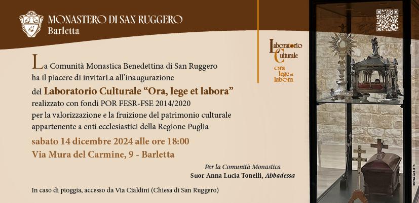 La Comunità Monastica Benedettina di San Ruggero in Barletta ha annunciato l’inaugurazione del Laboratorio Culturale “Ora, lege et labora”, un progetto nato grazie ai fondi POR FESR-FSE 2014/2020. L’iniziativa è stata pensata per promuovere e rendere più accessibile il patrimonio culturale appartenente a enti ecclesiastici e istituzioni della Regione Puglia. L’evento si terrà sabato 14 dicembre 2024 alle ore 18.00 presso la sede del … Continua a leggere