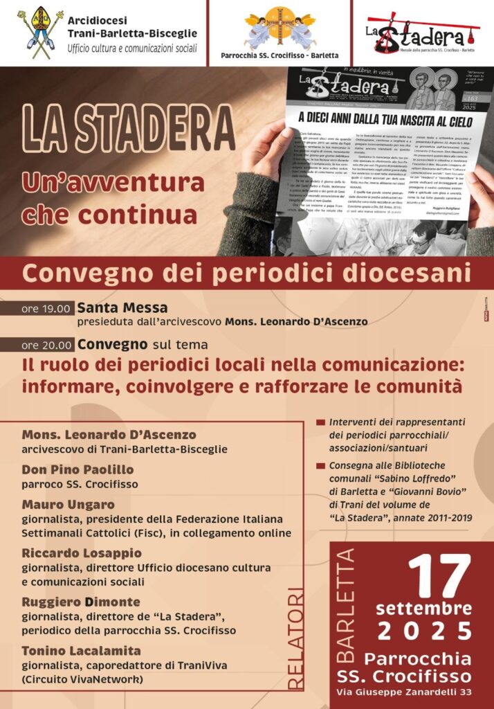 Una serata dedicata all’informazione e alla comunicazione diocesana è in programma a Barletta, presso la parrocchia del Santissimo Crocifisso, il prossimo 17 settembre. L’occasione è il convegno dei periodici diocesani, che si svolgerà sotto il titolo significativo “La Stadera, un’avventura che continua”. L’iniziativa si aprirà alle ore 19 con la celebrazione della Santa Messa, presieduta dall’Arcivescovo mons. Leonardo D’Ascenzo. A seguire, alle ore 20, … Continua a leggere