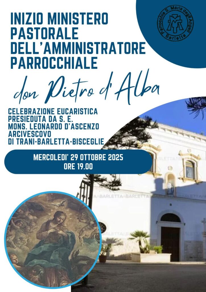 Mercoledì 29 ottobre 2025, a Barletta, nella parrocchia S. Maria degli Angeli, alle 19.00, durante la celebrazione eucaristica presieduta dall’Arcivescovo mons. Leonardo D’Ascenzo, don Pietro d’Alba inizierà il suo ministero di amministratore parrocchiale, succedendo a don Francesco Doronzo. Don Pietro d’Alba è nato a Canosa di Puglia il 2 maggio 1984. Diplomatosi presso l’Istituto Professionale Alberghiero di Molfetta nel 2003, ha vissuto il cammino del … Continua a leggere