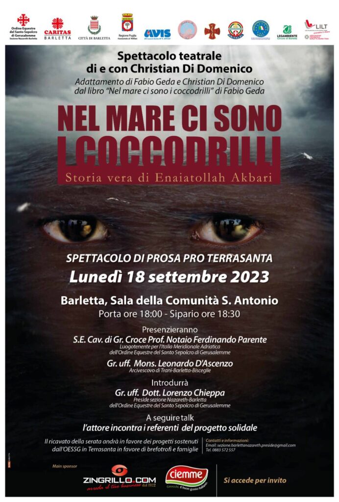 Lunedì 18 settembre 2023, a Barletta, nella Sala della Comunità S. Antonio, porta alle ore 18.00  – sipario ore 18.30, si terrà lo spettacolo teatrale “Nel mare ci sono i coccodrilli”, di e con Christian Di Domenico, adattamento di Fagio Geda e Chistian di Domenico dal libro “Nel mare ci sono i coccodrilli” di Fabio Geda. Nel mare ci sono i coccodrilli, non è … Continua a leggere BARLETTA. SPETTACOLO DI PROSA PRO TERRA SANTA »