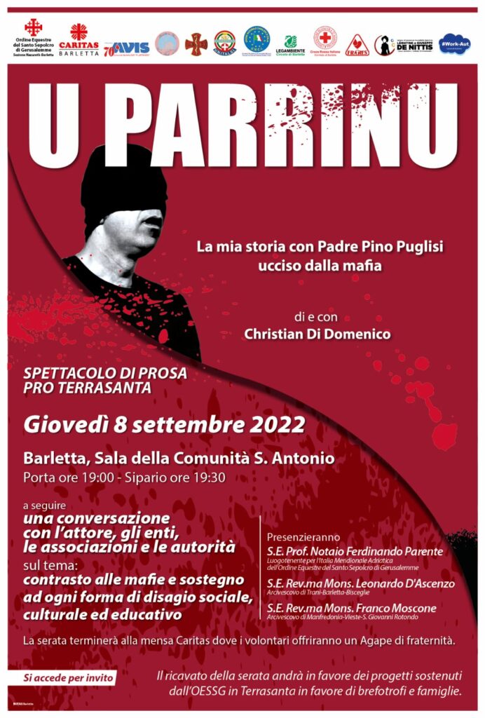 BARLETTA. UNA SERATA SU PADRE PINO PUGLISI, UCCISO DALLA MAFIA Giovedi 8 settembre, a Barletta, nella Sala della comunità S. Antonio, serata di prosa a sostegno dei progetti del OESSG in Terrasanta a cura della Sezione Nazareth-Barletta dell’ordine Equestre del Santo Sepolcro, potenziata dagli Enti ed associazioni del territorio. Sarà messa in scena la performance dal titolo “U Parrinu. La mia storia con Padre Pino … Continua a leggere BARLETTA. UNA SERATA SU PADRE PINO PUGLISI, UCCISO DALLA MAFIA