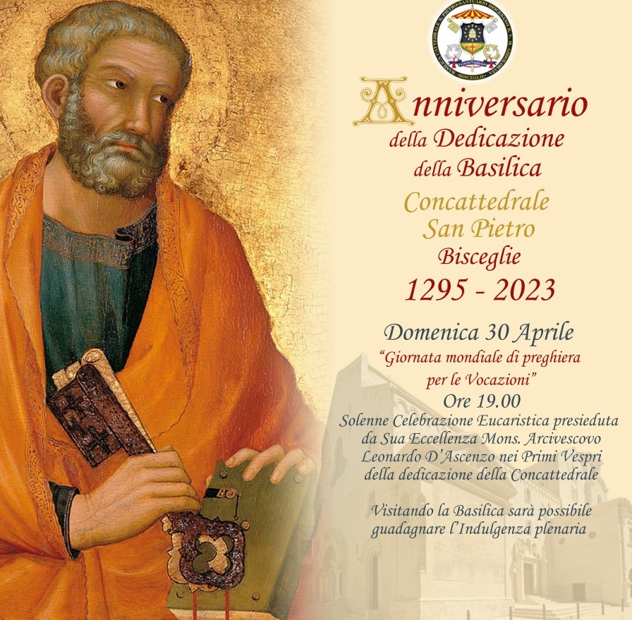 BISCEGLIE. DOMENICA 30 APRILE 2023- ANNIVERSARIO DELLA DEDICAZIONE DELLA BASILICA CONCATTEDRALE SAN PIETRO (1295 – 2023) “Giornata mondiale di preghiera per le Vocazioni” Ore19.00, Solenne Celebrazione Eucaristica presieduta da S.E. Mons. Leonardo D’Ascenzo nei Primi Vespri della Dedicazione della Concattedrale. Visitando la Basilica sarà possibile guadagnare l’Indulgenza plenaria