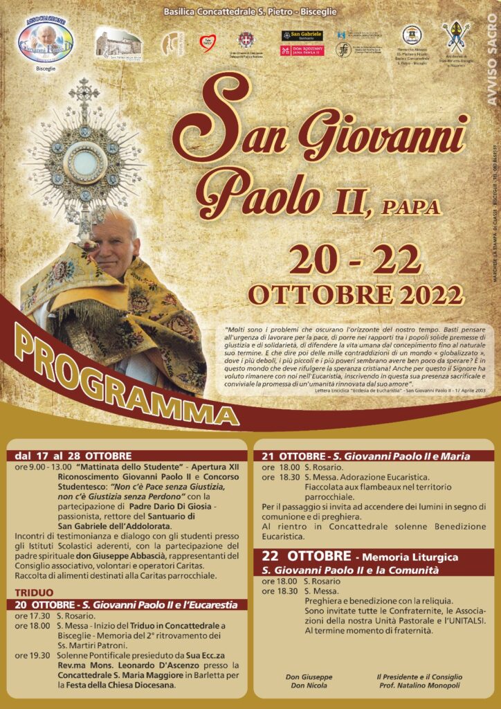 BISCEGLIE. FESTA DI SAN GIOVANNI PAOLO II, 20 – 22 OTTOBRE 2022 PROGRAMMA FESTA DI SAN GIOVANNI PAOLO II