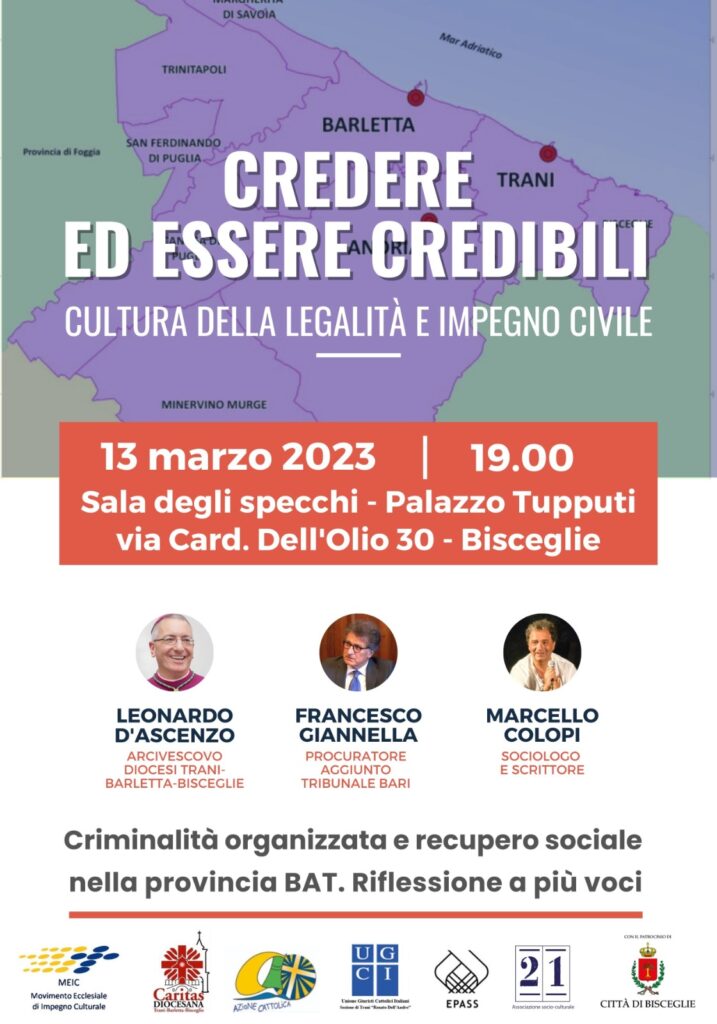 BISCEGLIE. FOCUS SU CULTURA DELLA LEGALITA’ E IMPEGNO CIVILE NELLA BAT Lunedì 13 marzo 2023, a Bisceglie, presso la Sala degli specchi a Palazzo Tupputi, via Card. Dell’Olio 30, alle ore 19.00, si terrà l’incontro “Credere ed essere credibili -Legalità e impegno civile” promosso dal gruppo MEIC Diocesano in collaborazione con Azione cattolica, UGCI, Caritas diocesana , EPASS e Associazione 21, per una riflessione a … Continua a leggere BISCEGLIE. FOCUS SU CULTURA DELLA LEGALITA’ E IMPEGNO CIVILE NELLA BAT