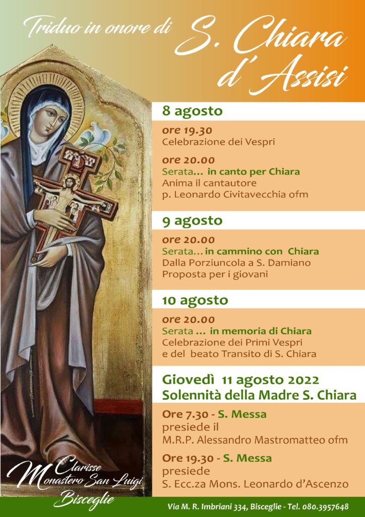 BISCEGLIE, MONASTERO SAN LUIGI, PREPARAZIONE ALLA FESTA DI SANTA CHIARA Lunedì 8 agosto ore 19.30: Celebrazione dei Vespri ore 20,00: SERATA…IN CANTO PER CHIARA     (anima il cantautore P.  Leonardo Civitavecchia ofm)   Martedì 9 agosto ore 20,00: Serata …IN CAMMINO CON CHIARA, Dalla Porziuncola a S. Damiano, proposta per i giovani   Mercoledì 10 agosto ore 20,00: Serata… IN MEMORIA DI CHIARA, Celebrazione dei  Primi … Continua a leggere BISCEGLIE, MONASTERO SAN LUIGI, PREPARAZIONE ALLA FESTA DI SANTA CHIARA »