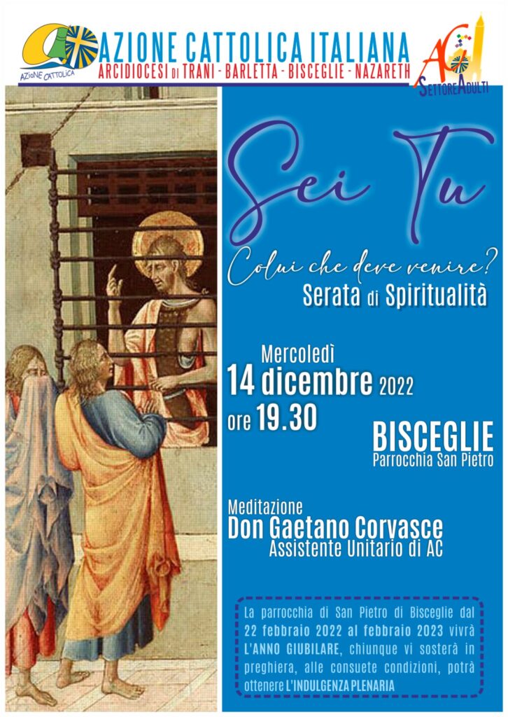 BISCEGLIE. SERATA DI SPIRITUALITA’ A CURA DEL SETTORE ADULTI DI AZIONE CATTOLICA Mercoledì 14 dicembre 2022, dalle ore 19:30 alle ore 20:30, a Bisceglie in via Amando Vescovo nr.29, presso la parrocchia San Pietro, il Settore Adulti di Ac propone una serata di spiritualità all’interno del percorso di Avvento sul tema “Sei tu Colui che deve venire?”. Don Gaetano Corvasce, Assistente Unitario dell’Ac diocesana e … Continua a leggere BISCEGLIE. SERATA DI SPIRITUALITA’ A CURA DEL SETTORE ADULTI DI AZIONE CATTOLICA