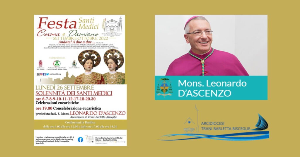 dioc. Trani BITONTO 26 SETTEMBRE 2022 – SOLENNITA’ DEI SANTI MEDICI 27 Settembre 2022 0 29 clic qui per l’articolo sul sito della Diocesi di Trani-Bisceglie-Barletta ARTICOLI CORRELATIALTRO DALL'AUTORE RITIRO DEL CLERO GIOVANE 24 NOVEMBRE 2025 GIORNATA PRO ORANTIBUS – MONASTERO SAN RUGGIERO INCONTRO DI CLERO ZONA PASTORALE TRANI “SAN NICOLA PELLEGRINO” Giovedì 20 novembre 2025 PDF: I CONTENUTI DEL PRIMO INCONTRO – Prof. Pier Cesare RIVOLTELLA Prof. Pier Cesare RIVOLTELLA – PRIMA SESSIONE INCONTRO DIOCESANO